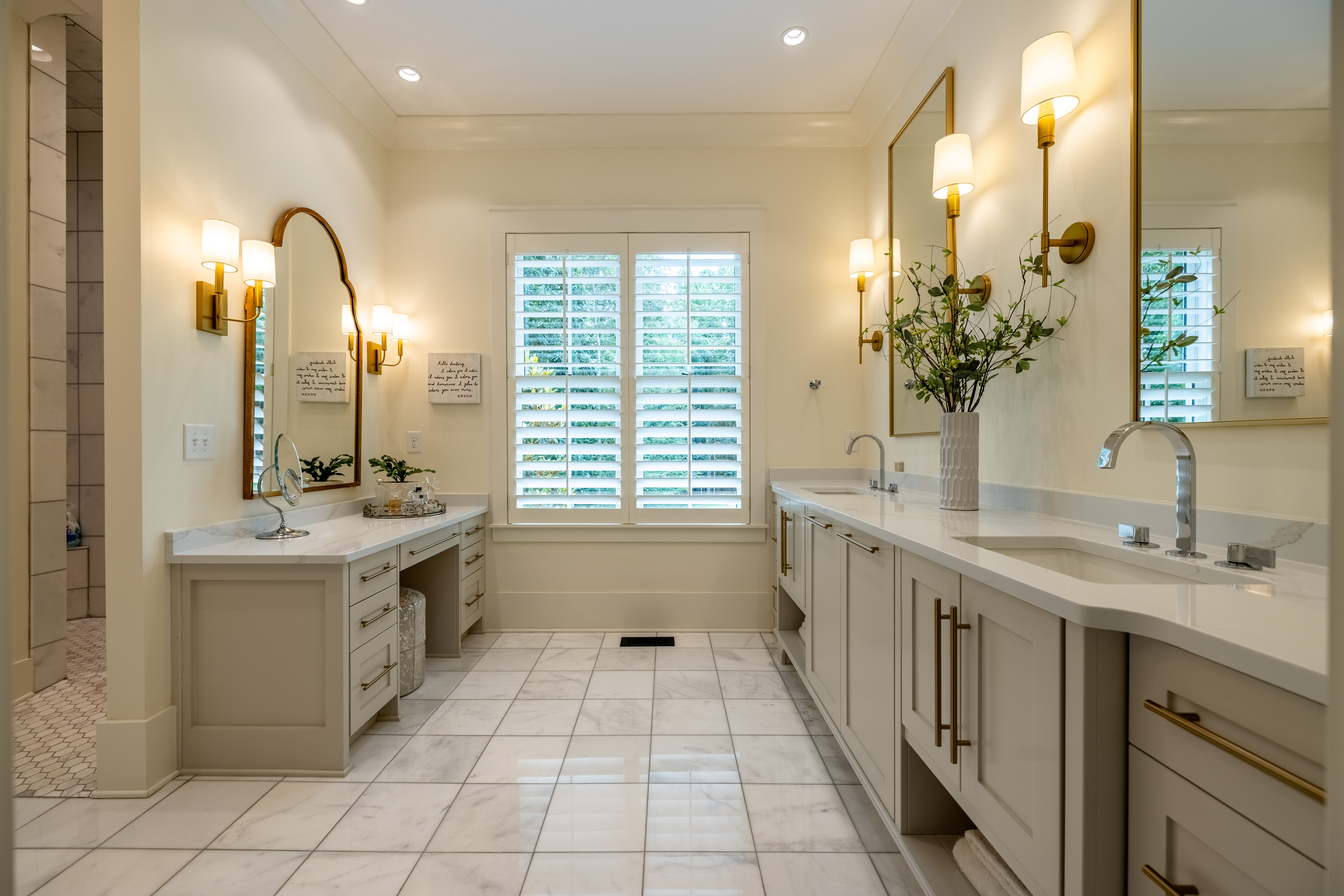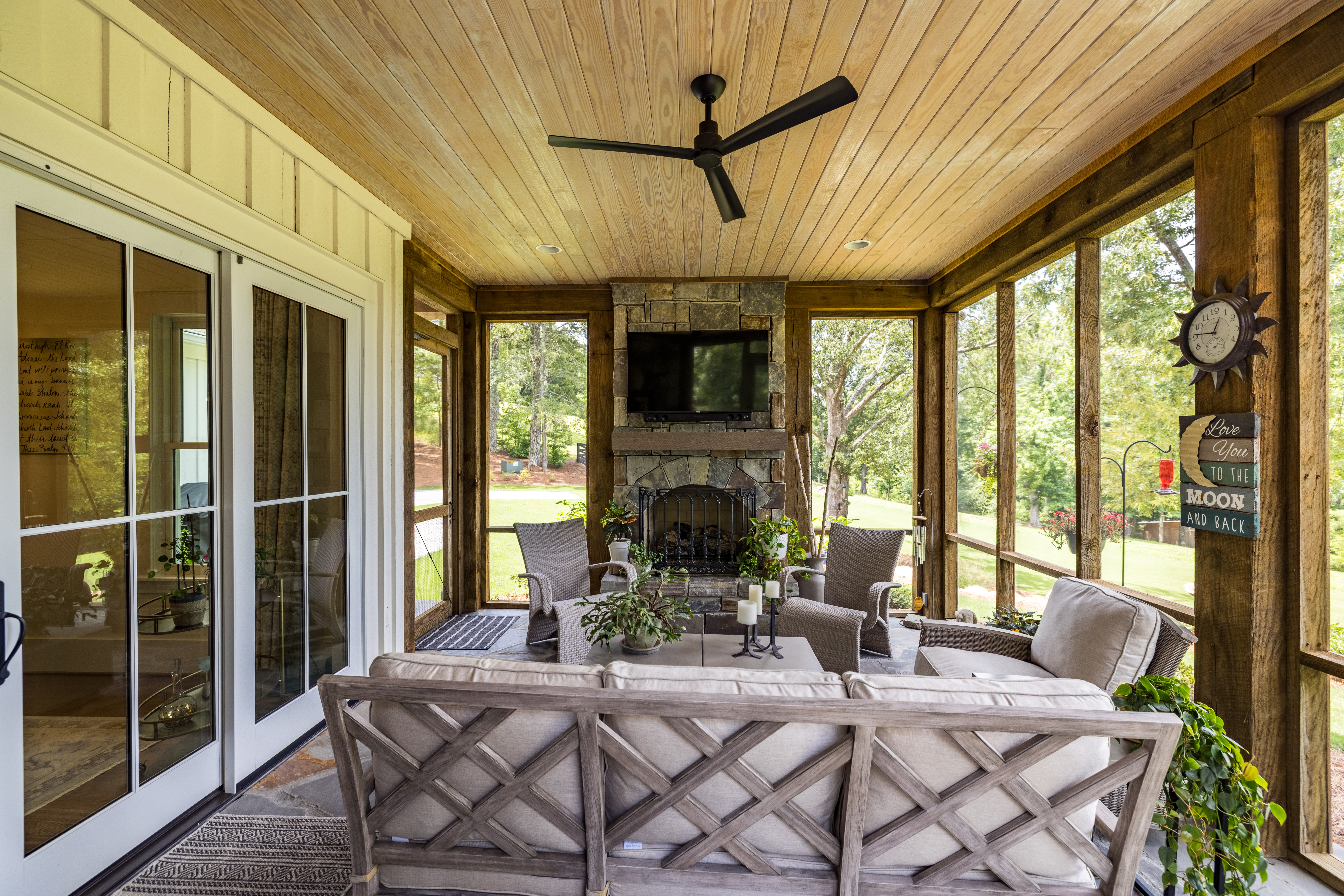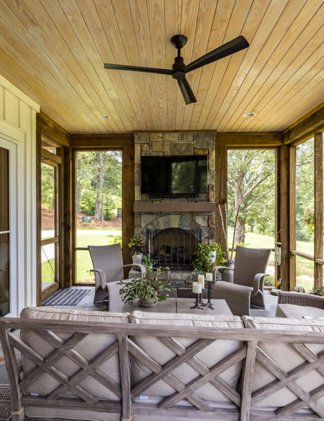 The primary suite features a spa-like bathroom with heated marble floors and a fully customized California closet. A spacious laundry room adds convenience, while the screened-in porch with a gas fireplace offers a cozy spot to enjoy the outdoors year-round.